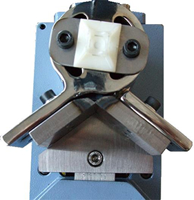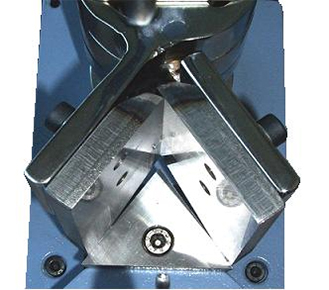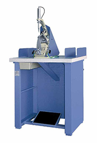 Pneumatic collar turning and points shearing machine, used for shearing the excess fabric from the tips of the collar and turning the processed piece inside out. Equipped with safety device as per CE standards, workpiece holder, object drawer, and discharge channel for work scraps. 90° blade as standard supply.