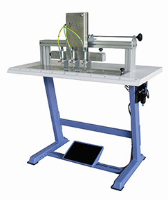 Pneumatic machine used for marking the collar to facilitate assembly onto the shirt body. Uses needles to make the central reference mark and two lateral reference marks. The needles can be excluded in order to make pencil markings on particular fabrics. Completely adjustable by collar size and height, with the possibility to perform marking also on small and/or convex collars.