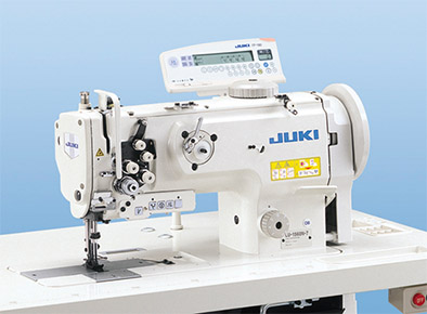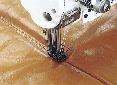 Two needle, unison feed lockstich machine with vertical axis large hook. The machine is applicable to an extend range of heavy materials for industrial use, such as cargo handling belts and containers, as well as those for general use, such as car seats, sofas and bags, thereby contributing to both improved quality and increased productivity.The machine has adopted a new mechanism that does not change the ratio of alternate vertical movement of the walking foot and presser foot even when the material thickness changes.