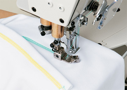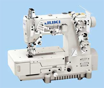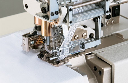 High-speed flat-bed top and nottom coverstitch machine. The machine can be used for the hemming process of the sleeves and bottoms of T-shirts and for the covering process for sportswear and knitwear.