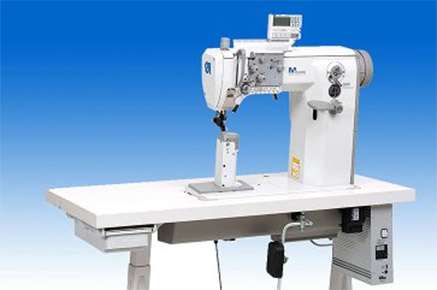 Twin-needle lockstitch postbed machine. With its outstanding performance parameters this series is setting new standards as regards stitching operations in the shoe production. In conjunction with the needle feed and the driven roller foot the double feeding of the wheel bottom feed ensures quiet and smooth sewing with exact stitch length, even when sewing over extremely thick spots. The manual back-tacking device ensures a "stich-in-stich" back-tacking.The special sewing kinematics allowing to use a thread variety unrivalled so far makes this series a promising operating means of universal use. Automatic thread trimmer, presser-foot lift and back-tacking with push-button are decisive factors for a high productivity.