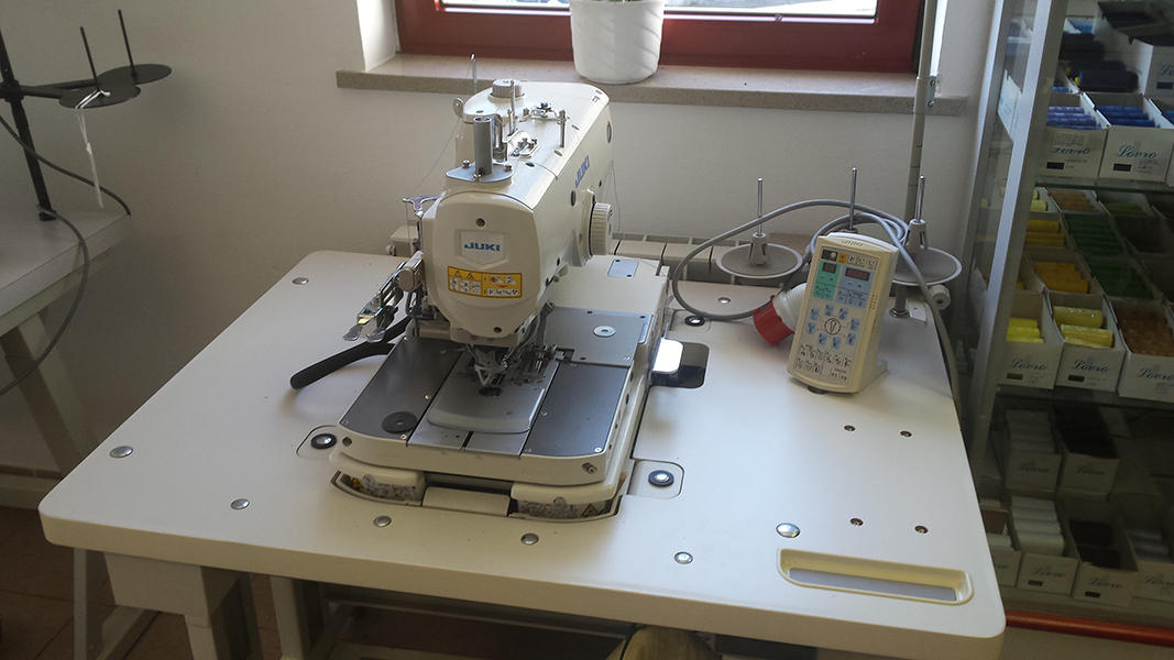 Computer controlled, eyelet buttonholing machine. Needle and looper thread tensions can be digitallyestablished on the operation panel according to sewing conditions. Thread tensions can be separatelyestablished for various sections of abuttonhole such as eyelet sections and parallel sections. The knife is controlled by a stepping motor. The right and left work clamps are separately driven by independent air cylinders. All pieces of data on sewing specifications can be established/selected on the operation panel.