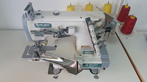 3 needle machine for tape binding on openings of leg or neck of underwear, T-shirt, etc. Binder’s opening size is 1-3/8’’ wide and finished size is 1/2’’ wide in 3 folds.