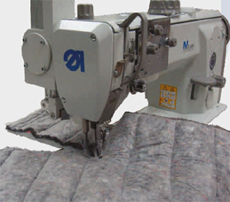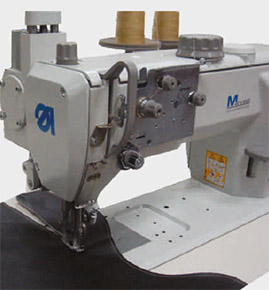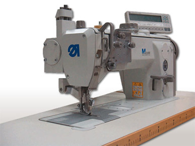 Jednoiglena ravna mašina za šivenje, sa trostrukim transportom, sposobnost učvršćivanja, sečenjem konca, pneumatskim podizanjem stopice, sa grejferom levo od igle i donjim uređajem za sečenje. U kompletu sa stolom, podrškom i elektronskim motorom.