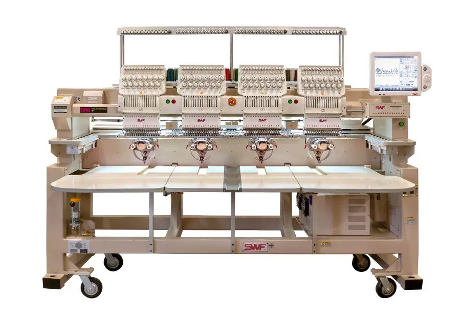 The SWF KS Series 4-head is controlled by it’s 15+ inch LED full Colour Touch Screen display and can hold up to 400 Embroidery Files, Handle up to 40,000,000 (40 Million) stitches of which each stitch file can be up to 20,000,000 stitches in size making the new SWF KS Series unique! With all of these new benefits and features you can produce up to 20% more productivity than any other embroidery machine in the world stitching at 1,000spm!