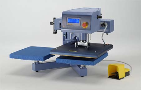 Pnevmatska transfer preša z dvema ploščama, premikajočo grelno ploščo, pedalom ter zaščito za roke. Elektronska ter digitalna nastavitev časa in temperature ter opozorilo pred morebitnimi napakami. Zamenljive spodnje plošče.