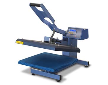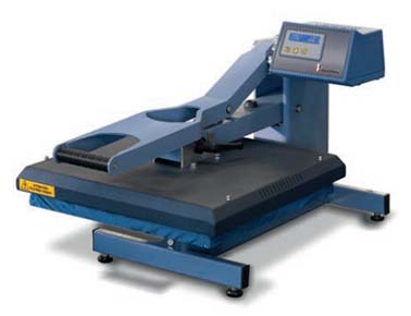 Ročna transfer preša. Zgornja plošča ni pritrjena na tog način ampak se samodejno prilagodi, da zagotovi enoten pritisk med obema ploščama. Digitaln nastavitev časa in temperature. Spodnja plošča je zamenljiva.